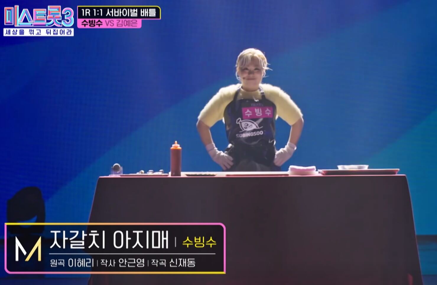 127만유튜버와 수빙수와 가왕 김연우와 같은 핏줄 김예은의 대결. 세계최초 트롯 무대 퍼포먼스를 준비해 온 수빙수는 무배에 본인의 실제 유튜브방송을 하듯 방어 해체쇼를 선보이고, 간주 중 김성주 MC에게 시식까지 하는 여유를 보여줍니다. 그러면서도 흔들리지 않는 노래실력에 수빙수의 끼는 어디까지일까 궁금해지게 만들며 올 하트를 기록, 김예은 또한 절절한 감성과 탄탄한 노래실력을 보여주지만 한걸음 무엇인가 넘지 못한 벽에 아쉽게 수빙수만 다음라운드로 진출하게 되었습니다.